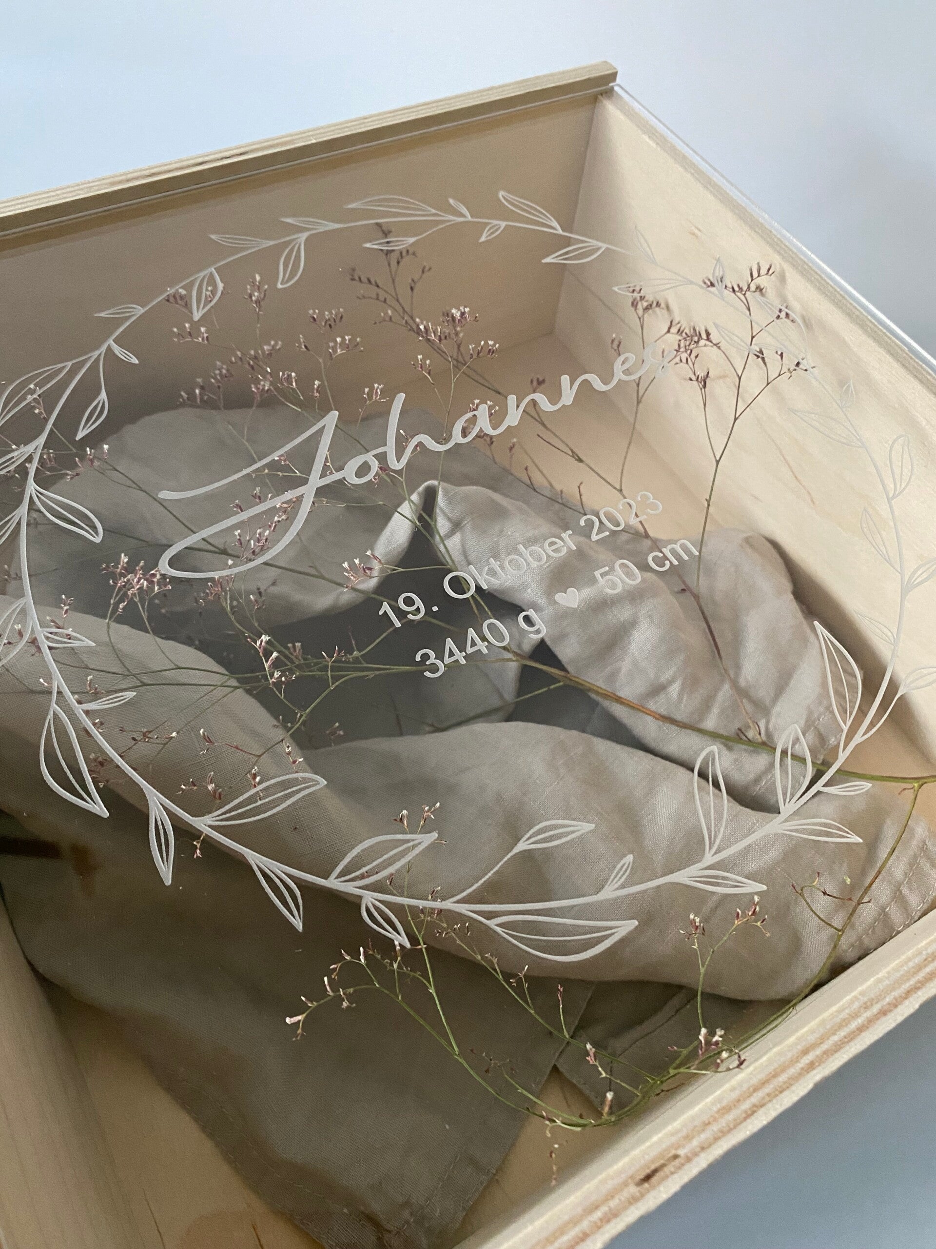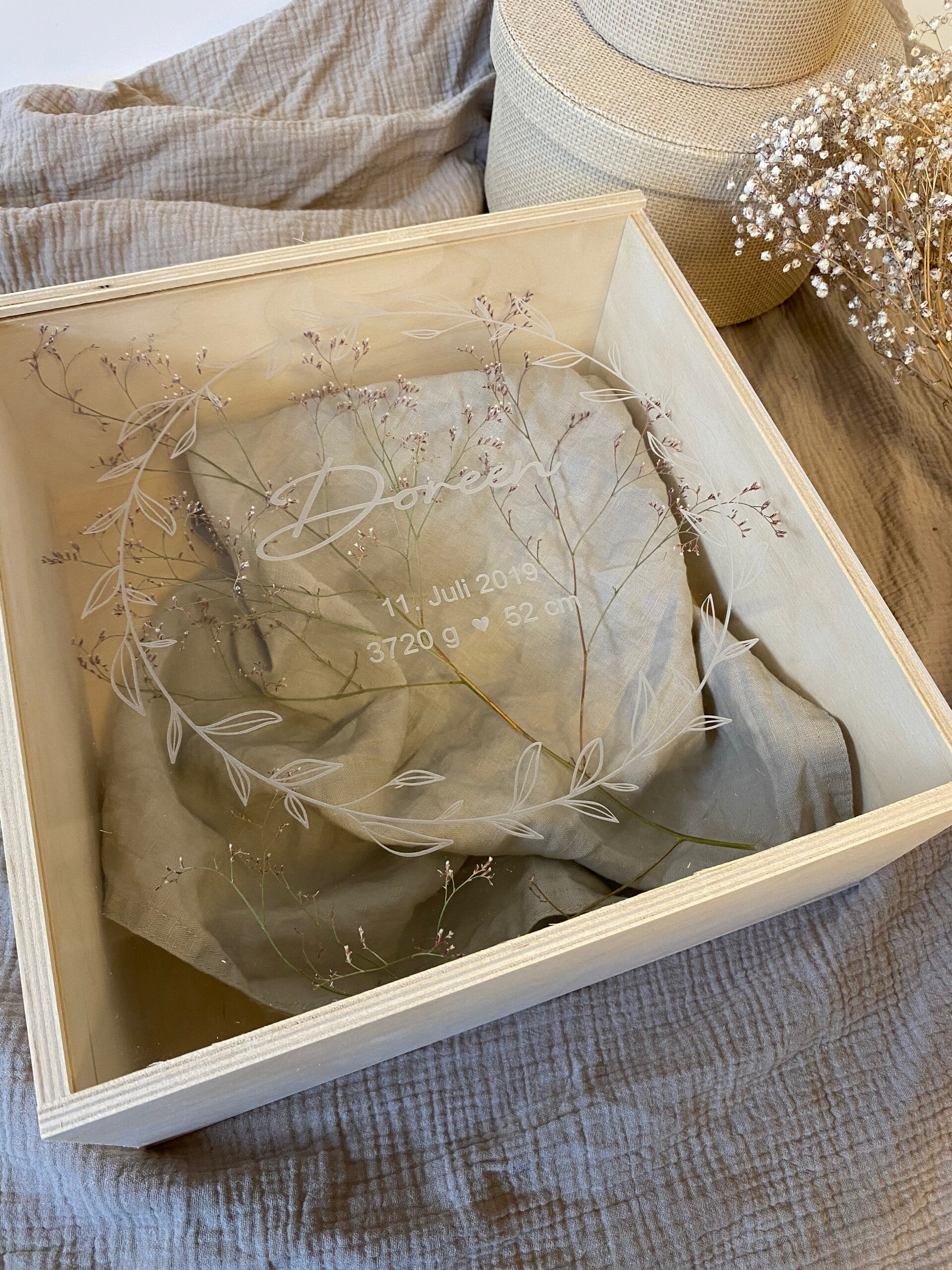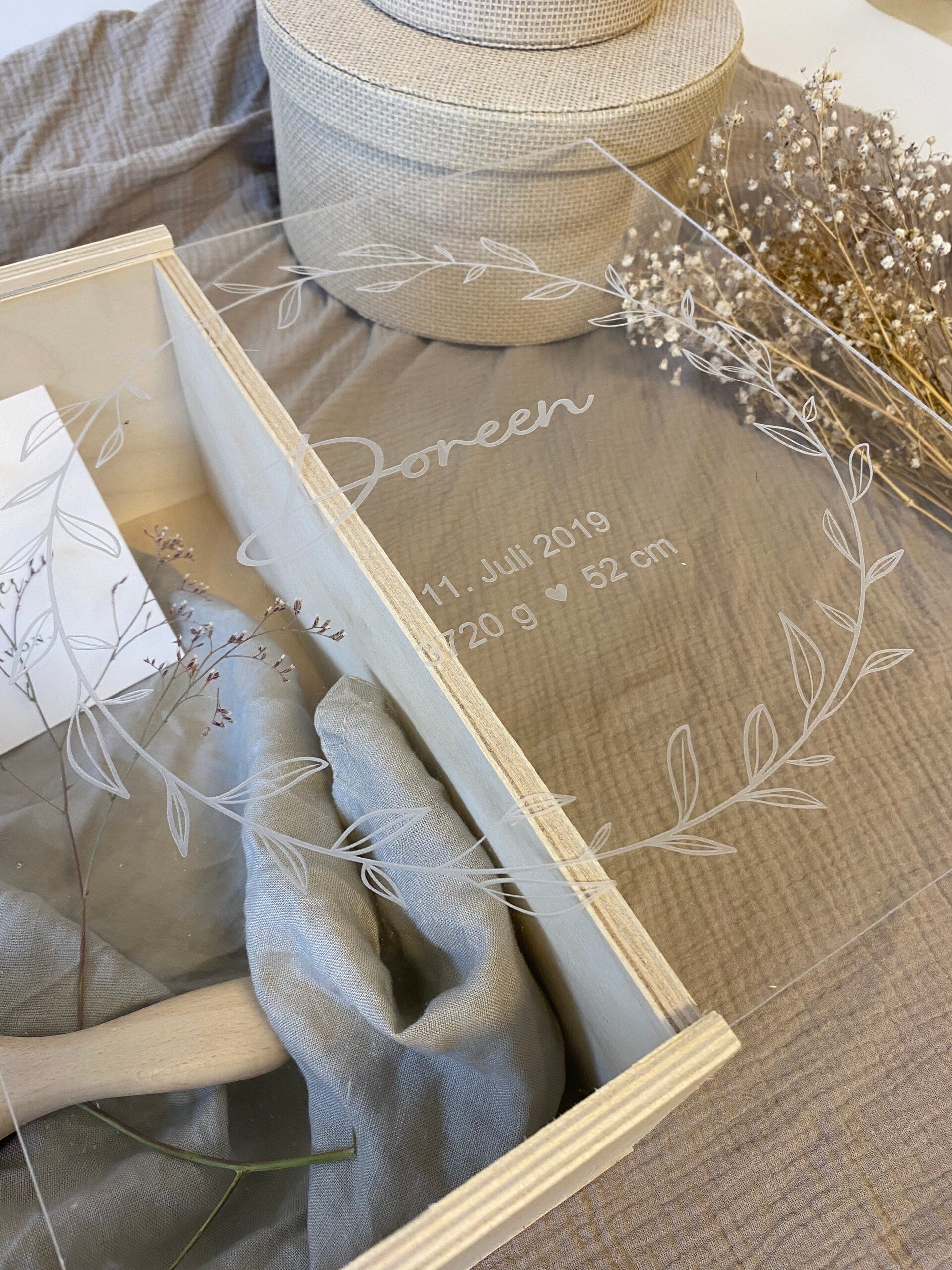 - Unsere Erinnerungsbox ist mit einem Schiebedeckel versehen und wird mit deinen Wunschdaten graviert.