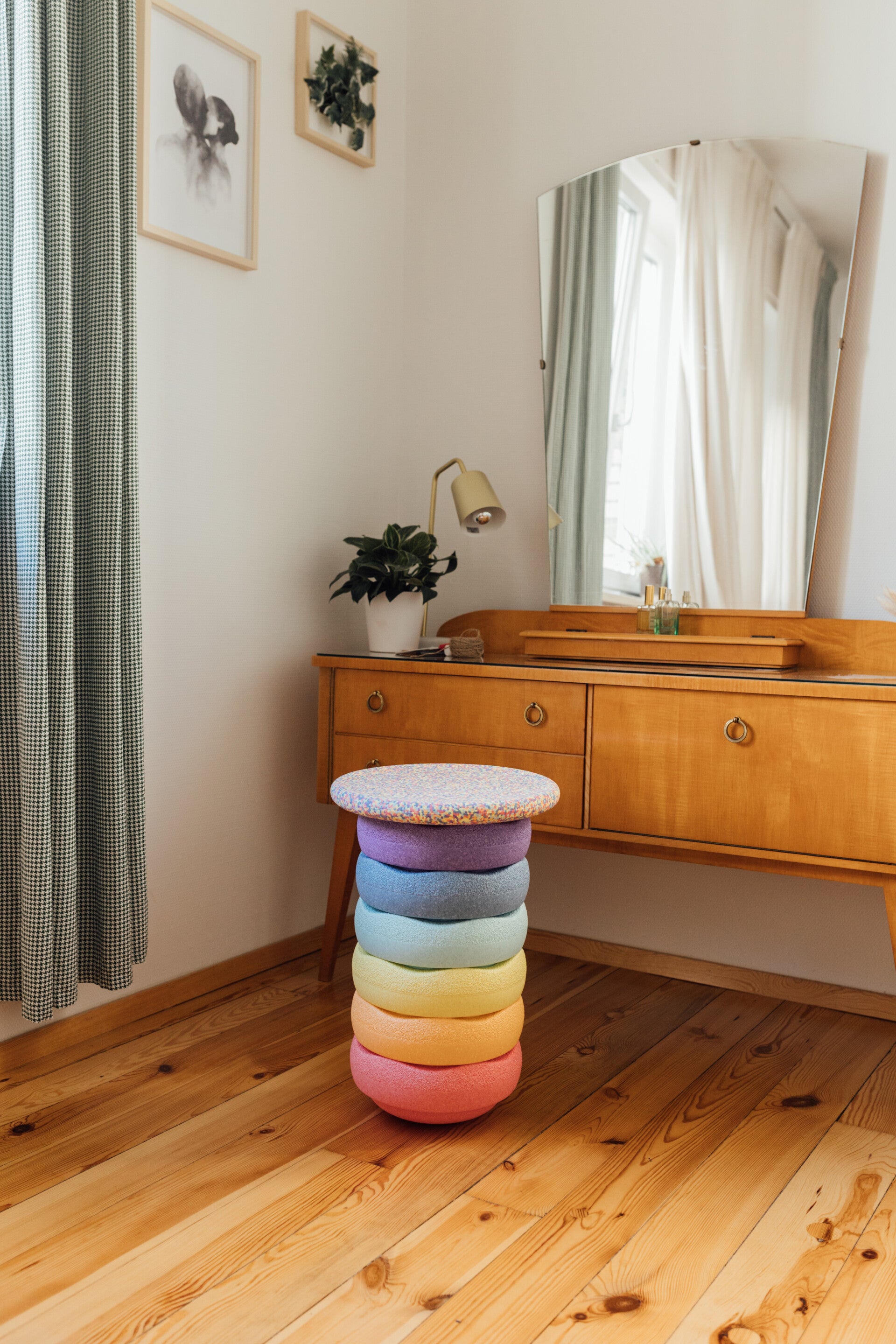 Der neue Stapelstein rainbow pastel 6 +1 Balanceboard ist ein Blickfang in jedem Raum. Durch die leichten, hellen Farben fügt er sich in jede Wohnung und in jedes Kinderzimmer ein. Die Stapelsteine in Pastellfarben lassen sich mit allen anderen Stapelsteinen und Stapelstein boards kombinieren.ne.